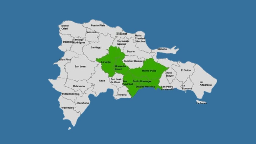 Las provincias en alerta verde son: Santo Domingo, Distrito Nacional, San Cristóbal, La Vega, Monseñor Nouel y Monte Plata