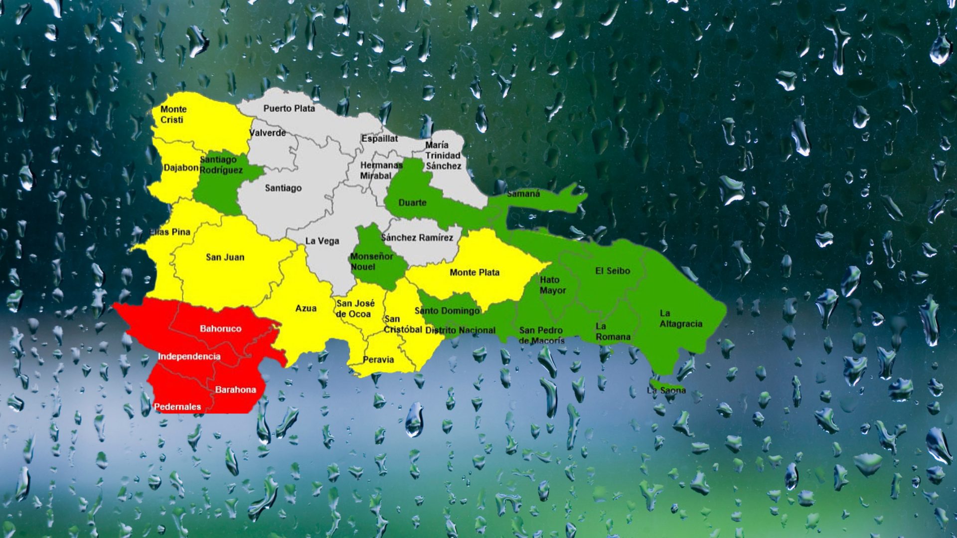 En alerta verde están: Monseñor Nouel, Samaná, San Pedro de Macorís, Santo Domingo, Duarte, La Romana, Hato Mayor, La Altagracia, El Seibo, Santiago Rodríguez, Distrito Nacional.
