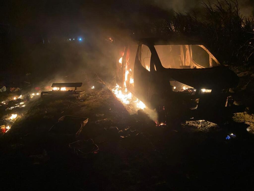 Posteriormente, incendiaron el vehículo, una Nissan NV200, año 2017, color blanco, placa No. 14039, que figura a nombre de una de las víctimas, identificada como Gustavo Alfonso Aquino Tejada.